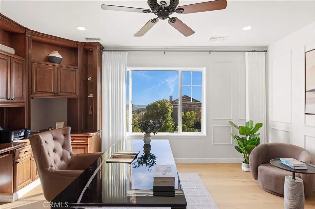 A rare opportunity to own a beautifully upgraded, move-in ready residence positioned in one of the highest locations within a 24-hour guard-gated community in Mission Viejo. Situated at the end of a quiet cul-de-sac, this exceptional home enjoys open scenic views from both the front and back, capturing Saddleback Mountain vistas and sparkling city lights. The true south-facing backyard provides abundant natural sunlight and enhanced privacy. Extensively remodeled in 2025 with approximately $300,000 in high-quality upgrades, the home has been thoughtfully transformed into a refined, modern residence with turnkey convenience. The redesigned kitchen features a widened center island with marble waterfall edge, marble countertops and backsplash, new hood, cooktop, sink, dishwasher, brand-new refrigerator, and four built-in ovens. Under-cabinet lighting and a spacious walk-in pantry provide both style and functionality. All three bathrooms have been fully remodeled with new vanities, updated showers and soaking tub, glass enclosures, Toto toilets, and LED lighted mirrors. The laundry room has also been renovated. The upstairs loft has been enclosed with custom glass walls and doors, creating a flexible space ideal for an office. The third tandem garage bay has been upgraded with glass doors and new flooring, offering potential for a gym, office, or multipurpose room. Additional upgrades include recessed lighting throughout, elegant crystal chandeliers, fresh interior paint, custom wall moldings, marble-accented fireplace, integrated sound system, and engineered wood flooring on the upper level. Motion-sensor lighting has been added beneath the staircase. The spacious primary suite enjoys scenic views and features dual vanities, a makeup area, a large shower, and a jetted soaking tub. Two secondary bedrooms are well sized and each includes a walk-in closet. The professionally designed backyard offers a lighted jacuzzi spa, built-in BBQ, outdoor speakers, and refined landscaping. A scenic trail and neighborhood park are just a short walk away. Residents also enjoy access to Mission Viejo Lake amenities including beach areas, boating, docks, picnic areas, BBQ facilities, playgrounds, and year-round community events. Conveniently located near shopping, dining, and highly regarded schools.