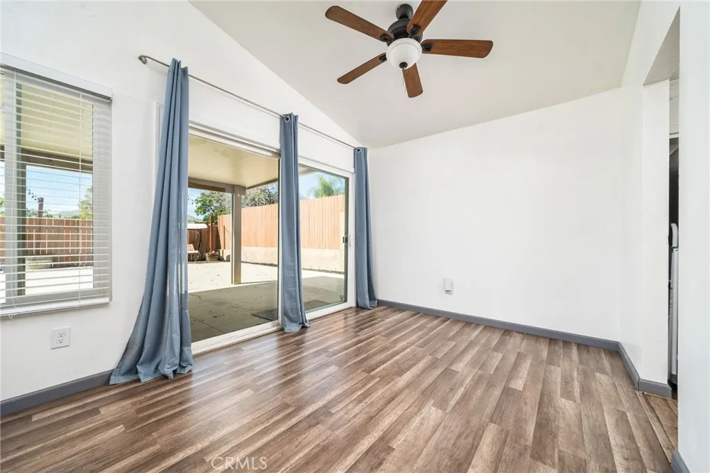 Welcome to 11633 Prosperity Ln in Moreno Valley, a beautifully upgraded single-story home offering comfort, style, and the perfect space to entertain! This single story 4-bedroom, 2-bath residence nestled in the privacy of a cul-de-sac features 1,592 sq ft of living space situated on a generous 7,405 sq ft lot. Enter inside to find durable and modern LVP flooring throughout, creating a seamless flow from room to room. The inviting living room boasts vaulted ceilings that enhance the natural light and create an open, airy feel. Enjoy peace of mind with major upgrades already completed, including new high-efficiency windows and a brand-new heating and A/C system with new ductwork, designed for year-round comfort and energy efficiency. An upgraded electrical panel with installed 220V wall charger is perfect to suit all your electric vehicle needs! Exit outside to your private backyard retreat featuring a huge Alumawood patio cover complete with recessed lighting and two ceiling fans. Whether you’re hosting summer BBQs, celebrating special occasions, or simply relaxing with family and friends, this outdoor space is truly perfect for gatherings. With thoughtful upgrades, functional living space, and an entertainer’s backyard, this home is ready for its next proud owner. Don’t miss the opportunity to make it yours!