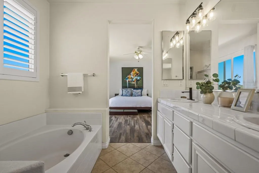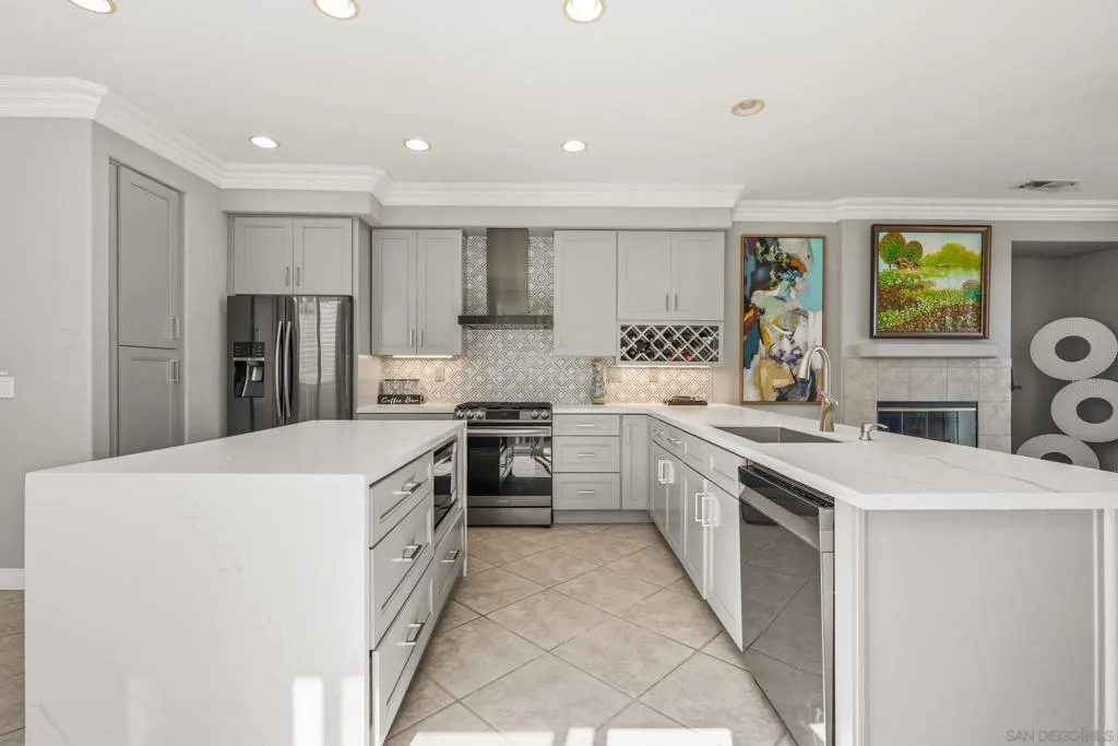 Welcome to this stunning home perfectly situated in the desirable Versante community of Scripps Ranch. The heart of the residence is the modern kitchen, which was meticulously updated just 1.5 years ago with quartz countertops and all-new appliances. Throughout the interior, you will find premium finishes including new plantation shutters installed on most windows in 2025 and LVP flooring added to the staircase and the entire upper level in 2023. The primary suite serves as a true retreat, featuring its own private balcony to appreciate the fresh San Diego air and lovely easterly views of the mountains and hillsides. The living experience extends to the cozy dual gas fireplaces and a versatile floor plan that includes a convenient upstairs laundry room. This home is equipped with a two-car attached garage for ultimate convenience. Located near the best of Scripps Ranch, this move-in-ready gem combines recent high-end upgrades with a prime location.