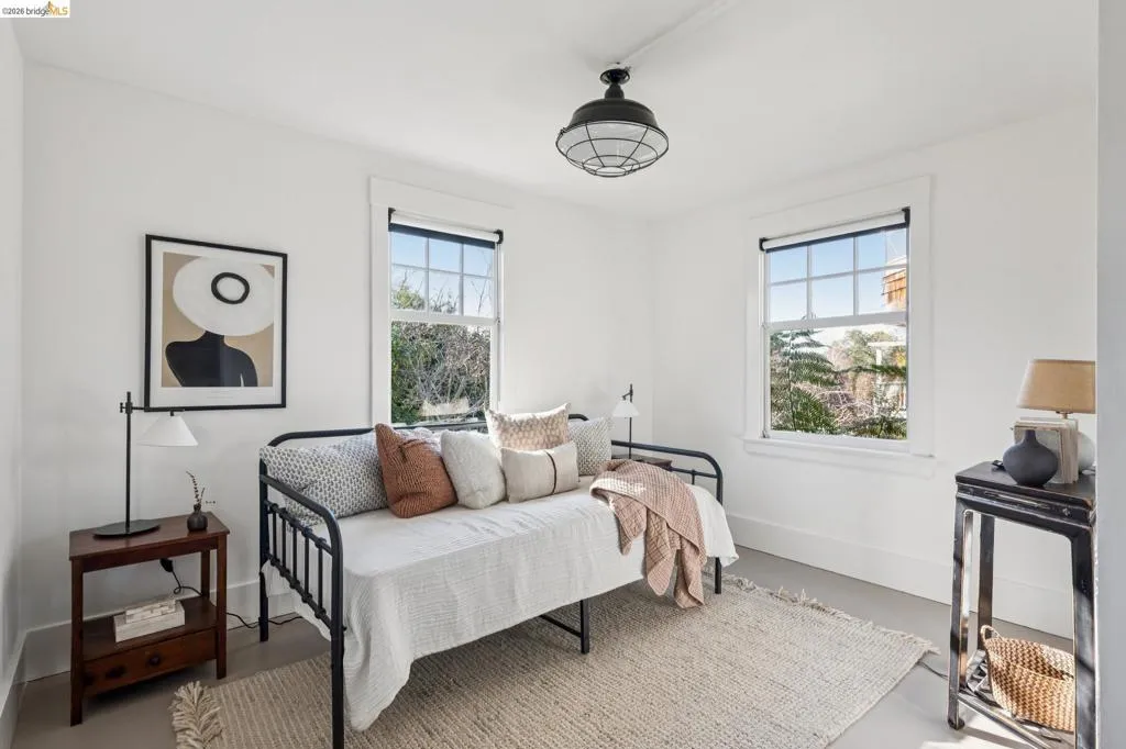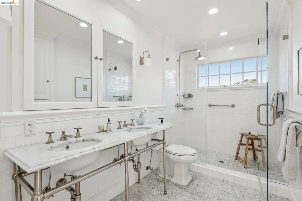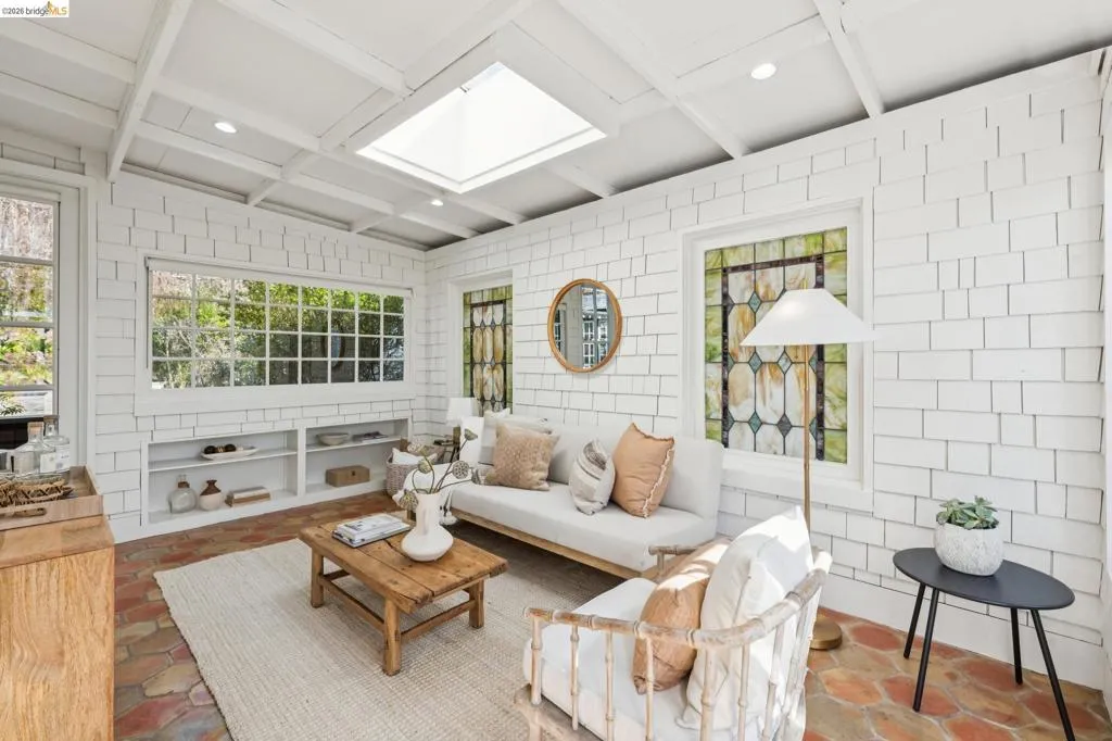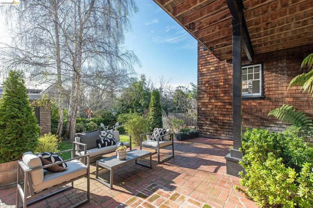 This sophisticated brown shingle home has been beautifully updated with a fresh, modern aesthetic. A charming garden pathway welcomes you to a spacious front porch and gracious foyer featuring high ceilings and elegant paneling. The chic kitchen showcases custom finishes throughout, including bespoke cabinetry, stone countertops, and high-end appliances. Eat-in breakfast area with a built-in banquette opens to the deck—creating wonderful indoor/outdoor living and beautiful views from the main level. The light-filled living room and adjacent sunroom feature oversized windows and French doors that open to a west-facing deck. An elegant dining room with high ceilings and grand bay windows provides a perfect setting for entertaining. The upper level offers 3 bedrooms and 2 bathrooms, including a spacious primary suite with a private bath, generous closets, and a bonus room with Bay views—ideal for a home office, nursery, or sitting area. The lower level includes an additional bedroom and full bath, along with a comfortable family room with direct garden access. A detached garage with windows and power provides excellent flexibility for a gym, office, or potential ADU. The garden is classically designed to offer options for al fresco dining, urban gardening, entertaining, and play!