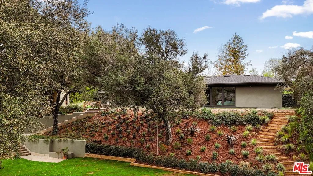 Welcome to this single-story, 4-bedroom, 3.5-bath mid-century residence tucked away on a peaceful cul-de-sac in Pasadena's prestigious San Rafael neighborhood. Set on a rare 17,325 sq ft parcel abutting San Remo Road, the home offers exceptional privacy, space, and design pedigree in an idyllic setting.Inside, an expansive living and dining area welcomes you with floor-to-ceiling windows and doors that frame views of the lush, landscaped backyard. A striking central fireplace and hearth anchor the space, creating a warm and inviting atmosphere ideal for gathering or relaxing.The remodeled chef's kitchen features custom cabinetry, quartz countertops, vibrant tile accents, professional-grade stainless-steel appliances, and a stunning center island with seating for eight. Bath and kitchen hardware by Waterworks elevate every detail, while an adjacent pantry with open shelving and abundant storage adds both function and charm. A chic powder room completes the main living area.Down the hall are four spacious bedrooms and three bathrooms all completely renovated with custom Italian terrazzo floors and walls. A serene owner's suite with private bath, sunken oversized bathtub, direct access to the backyard. Underneath the suite with hidden access is a 500 sq ft bunker encased in cement and steel, complete with walk in vault. The house presents the pinnacle of luxury design and security.Outside, a secret garden unfolds lush, layered, and completely private. A welcoming patio creates seamless indoor-outdoor living, while terraced steps lead to a beautifully landscaped, expansive grassy yard and a vast flat expanse beyond, awaiting your creative vision whether a pool, guest house, or garden retreat.
