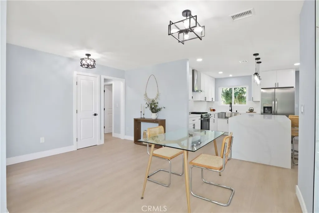Welcome to your little slice of paradise! This absolutely stunning remodel blends modern comfort with tasteful nods to mid-century modern architecture. Perfectly positioned on a large, slightly elevated corner lot, this beautifully upgraded home offers both style and space in an inviting setting. Step through the oversized front door and immediately feel the sense of calm created by the open, airy, and light-filled floor plan. Abundant natural light pours through the home, highlighting the warm and inviting luxury vinyl plank flooring that seamlessly connects each living space. The spacious kitchen flows effortlessly into the dining and living areas, making it perfect for entertaining or everyday living. Thoughtfully redesigned, the kitchen showcases a striking quartz waterfall island, a large stainless steel farmhouse sink, shaker-style cabinetry, quartz countertops with matching backsplash, a convenient drawer microwave, and a clever corner lazy Susan for added storage. Both the kitchen and bathrooms have been completely remodeled with high-end finishes. Bathroom upgrades include Kohler fixtures, quartz countertops, illuminated mirrors, a luxurious walk-in shower with dual shower heads, and a large soaking tub designed for relaxation. Major system upgrades provide peace of mind, including a brand-new roof, new central heating and air conditioning, and new windows and doors throughout. The garage is also equipped with a 220V EV charger, adding modern convenience for electric vehicle owners. Outside, the expansive lot offers endless possibilities. Whether you envision a lush garden retreat, outdoor entertaining space, pool, or additional enhancements, the generous property provides the perfect canvas to create your own private oasis. This exceptional home combines thoughtful design, modern upgrades, and incredible potential—all in one remarkable property.