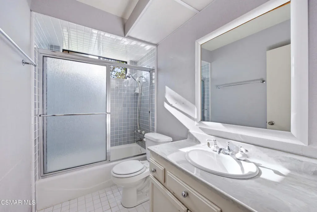 Opportunity awaits in Oak Park's sought-after Country Meadows community. Tucked at the end of a cul-de-sac, this attached single-family offers a versatile floor plan, scenic mountain and sunset views, and the chance to make it your own. The main level offers a desirable single-story living feel, featuring high ceilings in the living room, a fireplace, and access to a private balcony, with an adjacent dining room ideal for everyday living and entertaining. The kitchen includes a breakfast nook and additional storage. The spacious primary suite is conveniently located on the main floor and features high ceilings, an ensuite bath with dual vanities, a separate tub and shower, and a private toilet area. Two additional bedrooms and a hall bath with tub/shower combo complete the main level. Downstairs, a large family room or bonus space with built-ins, fireplace, bar area, and patio access offers flexible living and entertaining options, along with a fourth bedroom and full hall bath. Outdoor spaces are designed to enjoy the beautiful views, with room for dining and gathering. Additional highlights include direct garage access, guest parking just outside, and access to the community pool and spa. Don't miss this exceptional Oak Park opportunity.