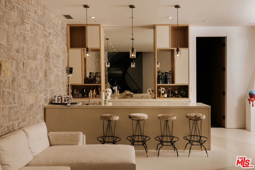 Defined by its striking use of stone and glass, juxtaposed against the dramatic backdrop of the city, The Bayou House, located in the famed Bird Streets, is a thoughtfully executed modern retreat by multidisciplinary designer Bradley Bayou. Completed in 2015, the home provides an unparalleled approach to craftsmanship, security, and functionality. Set behind a gated entry with mature hedges, feel welcomed home to a sense of privacy and effortless peace. A striking round entry with a glass ceiling, complete with a unique suction elevator, flows seamlessly to the formal living room. With floor to ceiling retractable glass walls on either side, the room beautifully showcases the home's infinity pool and manicured grounds. Back through the distinctive foyer sits the kitchen, complete with Miele appliances, its adjoining family room, featuring a two-sided gas fireplace and access to an additional courtyard, and the dining room. The wood and stone accents continue throughout the interior, as the sanctuary unfolds into the primary retreat. A serene ambiance is set by an additional fireplace, continued retractable glass walls, dual walk-in closets, and a spa-like bathroom. Two additional guest suites and a powder room sit on the main level. Descend down the grand, arched stairway to a lounge and bar area, a private theater room, the remaining two guest suites, a laundry room, and access to the subterranean 4-car garage. The home is complete with a Savant smart-home automation system, a gated driveway, and gated street entry. All of this, nestled in an iconic location just above the Sunset Strip in the prestigious Doheny Estates neighborhood.