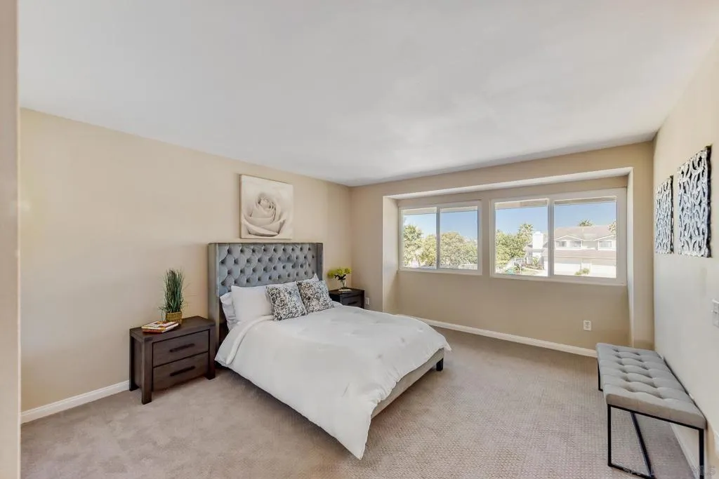 Welcome home to this refreshed 3-bedroom, 2.5-bath residence offering 1,480 sq ft of comfortable living in Feather Ridge, the highly desirable Rancho Peñasquitos community in the Poway Unified School District. Set on a quiet cul-de-sac and elevated above much of the surrounding neighborhood, this home offers privacy, quiet, and a prime location. The bright interior is filled with natural light from a skylight above the staircase. Downstairs showcases durable tile flooring and a warm and inviting living room that features a cozy fireplace. This home has been refreshed with brand new carpet and fresh paint, giving that move-in-ready feel. The functional layout includes a half bath dowstairs, an attached 2-car garage, and an extended driveway providing ample parking & convenience. Outside, enjoy your private backyard retreat with mature fruit trees, ideal for entertaining, gardening, or unwinding in a serene setting. Located just minutes from Highway 56 and I-15, this home offers easy walking access to top-rated schools, parks, shopping, and dining—all within a warm, established community. Run don't walk!