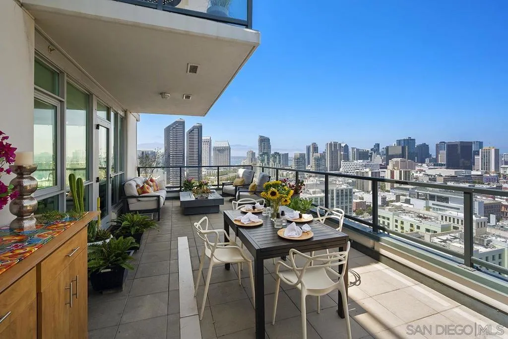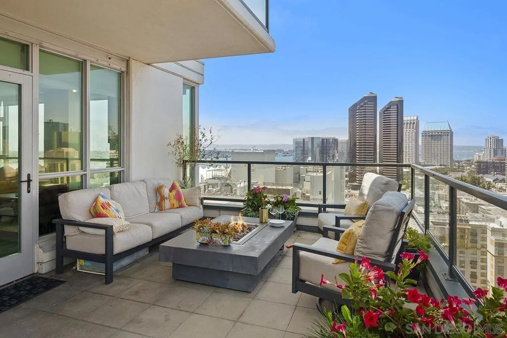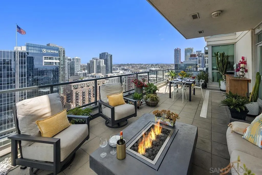 The epitome of Downtown living is realized in this extraordinary northwest corner penthouse series residence on the 21st floor of The Legend with a nearly 400 SQ FT ROOFTOP DECK! Stunning views span to the bay, city, and even Point Loma from this coveted property. Boasting a highly desirable floor plan with 2 separated bedrooms for enhanced privacy, PLUS a flex space, perfect for use a den, office, or media room. 2 side-by-side parking spaces plus a motorcycle space (owners have parked 3 cars in the spaces), 1 storage room and 1 storage cage! Complete with recently installed wood floors, upgraded lighting, ceiling fans, pre-wired for surround sound, and a stainless/granite kitchen with Sub-Zero refrigerator, you will love where you live. Quite possibly the best unit in the entire building with the combination of the views and roof deck – enjoy Petco Park events from ‘Club Legend’ but then retreat to the quietest corner of the building for some rest and relaxation! Dynamic views are framed by expansive windows in this fabulous residence at the Legend. An entertainer’s dream, you will love the space and functionality offered in this condo. Delight in a spacious kitchen with stainless steel appliances, granite counters including an eat-at bar, a convenient pantry closet, Sub-Zero refrigerator, and desirable gas range. Retreat to the primary bedroom boasting a generous walk-in closet with custom organizers. The primary en-suite bath features a dual vanity with upgraded granite counters, a walk-in shower, plus a Toto Washlet. Complete with additional storage and 2 side-by-side parking spaces plus a 3rd space for a motorcycle, this is an idyllic Downtown dwelling. The Legend is the only residential high-rise to be built inside the gates of our Major League Ballpark and the only residential tower to be built on the three-acre Park at the Park! This iconic building overlooking the Padres Ballpark will be treasured for generations with historic detailing preserved by Bosa to create a world-class residential tower. Enjoy a premium central location only steps away from the Gaslamp Quarter and Marina District for convenient access to endless shopping and dining options. The Legend’s amenities include a second-floor rooftop deck looking out over Park at the Park complete with pool and spa, a fully-equipped fitness room, rooftop garden, barbecue area, steam, sauna and changing rooms. Your guests and clients will also love 'Club Legend' located on the seventh floor, complete with a huge deck overlooking the ballpark and an outdoor fireplace lounge. An elegant courtyard entrance, creating a private enclave approaching the lobby provides a fitting and impressive sense of arrival for residents and their guests. The concierge service and 24-hour security add a sense of belonging while an ambiance of refinement and contemporary sophistication is apparent throughout the building.Builder's brochure indicated 1587 sqft, assessor's record indicates 1439 sqft.