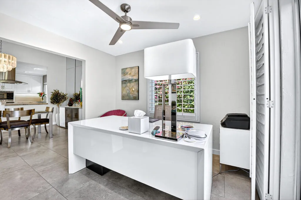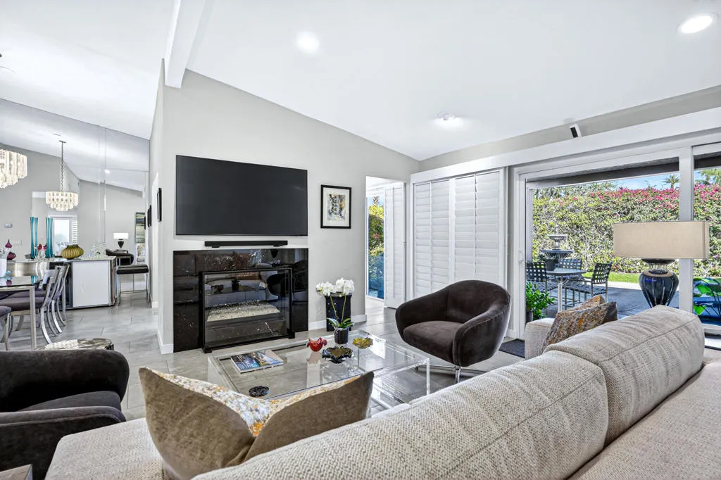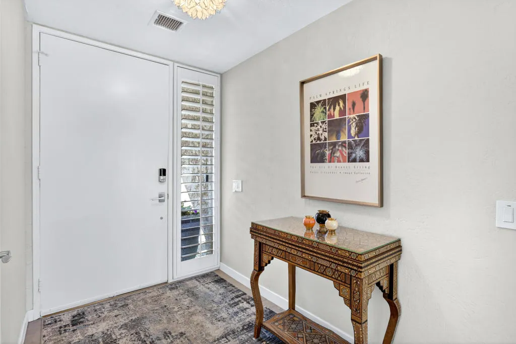 Located within the exclusive gated enclave of Rancho Estates, a boutique community entirely designed by renowned architect Donald Wexler, this beautifully reimagined Desert Modern residence offers a rare blend of architectural pedigree and refined contemporary living. Rancho Estates is comprised of just 28 detached homes arranged around a circular drive with shared amenities including tennis courts and a community pool, celebrated for its timeless design and serene desert setting. This extensively upgraded residence features designer upgrades throughout and showcases an open-concept floor plan filled with natural light. Expansive glass doors create a seamless connection to a private courtyard framed by lush landscaping and a tranquil water feature. Capturing both mountain and garden views, the home embodies the essence of indoor-outdoor desert living. The thoughtfully designed layout offers 3 bedrooms and 2 baths, including a spa-inspired primary ensuite with a calming, modern aesthetic. The kitchen is beautifully appointed with contemporary cabinetry, honed granite countertops, breakfast bar seating for four, and generous prep space, opening effortlessly to the main living and dining areas--ideal for entertaining. Additional highlights include custom built-ins, upgraded closet systems, and a thoughtfully designed, separate office, offering both functionality and style. A rare opportunity to own within a Donald Wexler-designed community in one of Rancho Mirage's most architecturally significant enclaves.