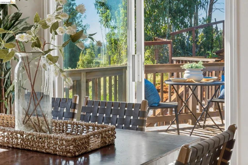 Set back from the street in Oakland’s Redwood Heights neighborhood, this four-bedroom, three-bath home offers privacy and Bay views. The main living area features an open flow with hardwood floors throughout, connecting the living room, dining room, and an updated kitchen with quartz countertops and stainless-steel appliances. Sliding doors off the dining room open to a spacious deck with steps leading to a patio and garden setting—ideal for outdoor dining, entertaining, or relaxing and enjoying the views. The main level includes a primary suite with en suite bath, plus two additional bedrooms and a full bath. Downstairs, a flexible in-law suite with kitchenette, living area, bedroom, and full bath offers space for guests or extended family, with both interior access and a separate entrance. Additional features include a newer roof, air conditioning, and owned solar panels. Conveniently located near Redwood Regional Park, Montclair Village, shops, cafés, and commuter routes.